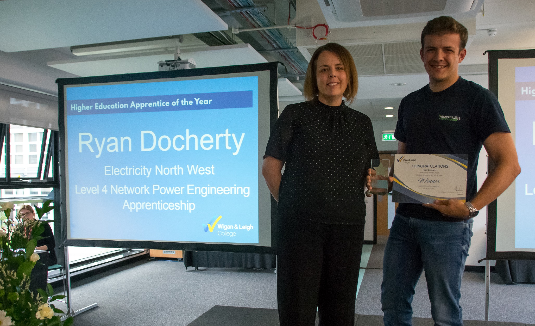 Not only that, Ryan Docherty fought off thousands of fellow apprentices to scoop the Higher Level Apprentice of the Year award. Electricity North West’s Ellie Chandler also made the shortlist for the award.